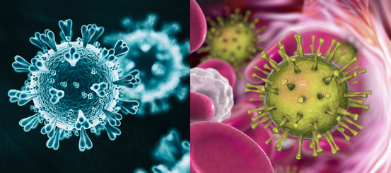 A gauche le covid-19, à droite le cytomégalovirus soupçonné de l'aider